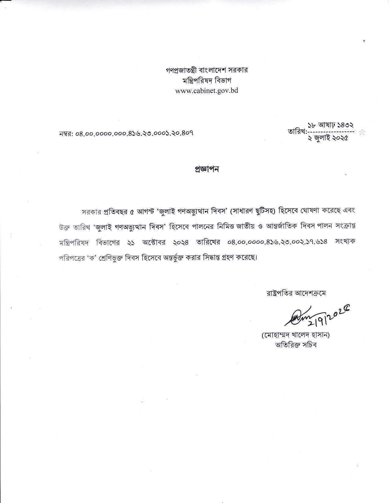 জুলাই গণঅভ্যুত্থান উপলক্ষ্যে ৫ জুলাই বিদ্যালয় ছুটি থাকবে।